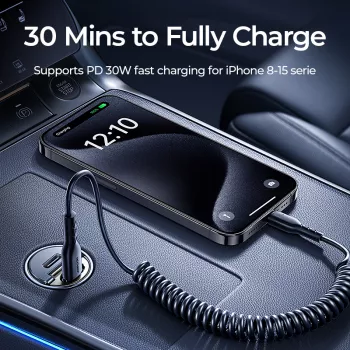 30W Dual Port USB-C Car Charger with Fast Charging & Pull Ring Design